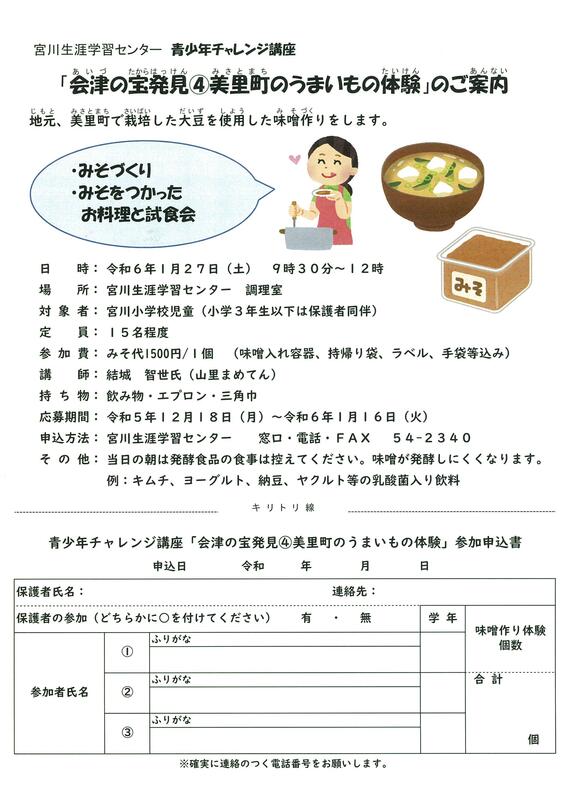 令和6年1月27日(土)、青少年チャレンジ講座「会津の宝発見④」を開催します。今回は美里町新鶴地区にあります「山里まめてん」の結城智世さんを講師にお迎えして、味噌づくりに挑戦します。