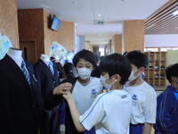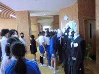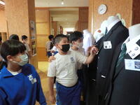 2023年6月6日 10時30分本日から6月13日(火)までの日程で、小学校玄関入り口付近に制服サンプルを展示しています。6年生が実際に制服を試着しながら検討していました。保護者の皆様も16時45分までご覧いただけますので、実物をご覧いただきアンケートにご回答ください。