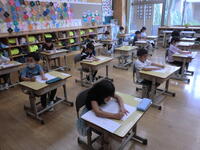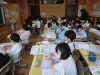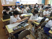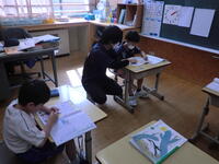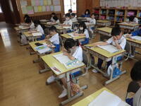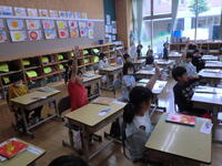 1時間目の授業の様子です。1の1は書写。ポイントを全員でおさえていました。1の2は国語。ひらがなから思いつく言葉を発表していました。2年生は国語。たんぽぽの知恵はどのようなものか考えます。3年生は音楽。音符の長さについて学んでいます。きらら学級は国語、算数。漢字や計算に一生懸命です。4年生は算数。わり算の計算の仕方について学習しています。5年生は社会。全員がタブレットを使って調べ学習をしています。6の1は外国語。映像を見ながら発音しています。6の2は算数。分数の計算がばっちりできています。今日も「チーム本郷」笑顔で頑張ります!!