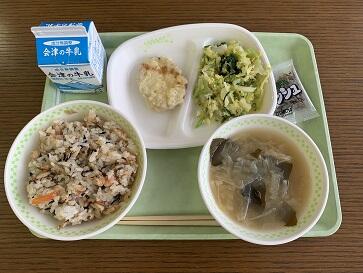 さて、今日の給食は「食育の日献立」です。まいたけご飯、おひたし、さつまいもの天ぷら、大根汁、小魚、ぎょうにゅうとなっていました。会津の野菜が多く使われ、地産地消にもなっていますね。