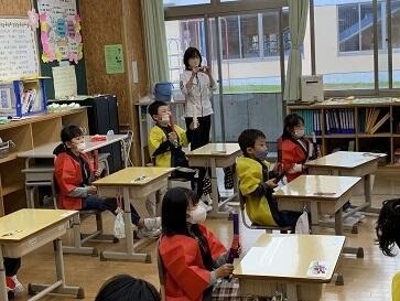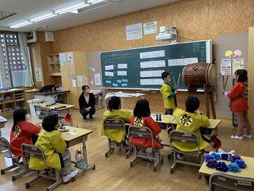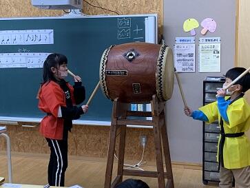 子どもたちは、学習発表会でも着た はっぴ をまとって、気分はお祭りモードになって授業を迎えました。内容は、太鼓のリズムをつくるものでした。はじめに、リズム内の練習をして、いくつかのリズムパターンをつかみました。そして、ペアで、それらを組み合わせてリズムを作るというものでした。子どもたちは、ラップの芯等で机を叩きながら、楽しくリズムを作っていました。代表で発表する時には、本物の太鼓を叩いて発表しました。お祭りと言ったら、やっぱり太鼓のリズムですね。