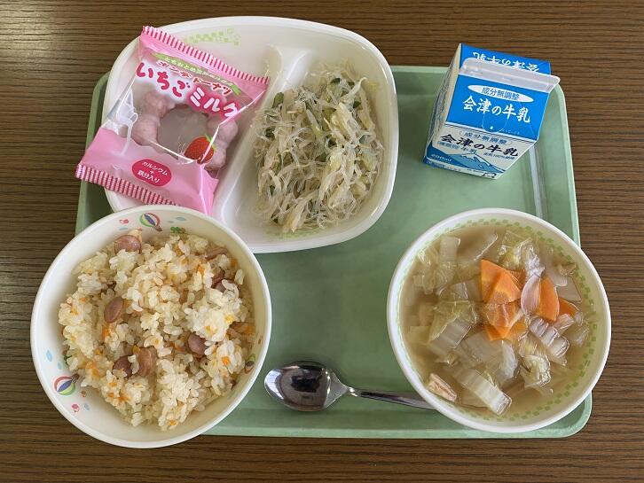 今日の給食は、「7月お誕生日献立」でした。五目チャーハン、春雨サラダ、えびボールと白菜の中華スープ、牛乳、いちごのポン・デ・リングがデザートに付いてうれしかったですね。子どもたちも喜んでいました。