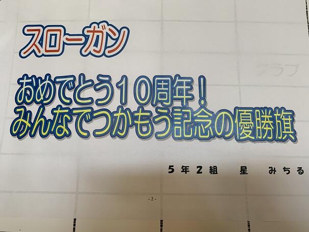 運動会のスローガンが決まりました。5年生の星みちるさんが考えてくれたスローガンが選ばれました。