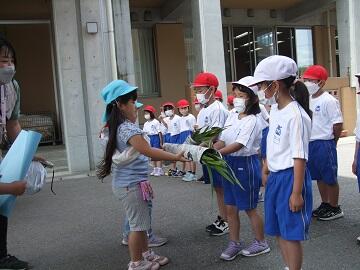 さて、今日は本郷こども園の年長さんが、本郷小学校に菖蒲を届けてくれました。ありがとうございました。1年生が代表して受け取り、お礼を言いました。5月5日に菖蒲湯に入る慣習がありますね。少し遅れましたが、菖蒲湯に入ってみるのもいいですね。