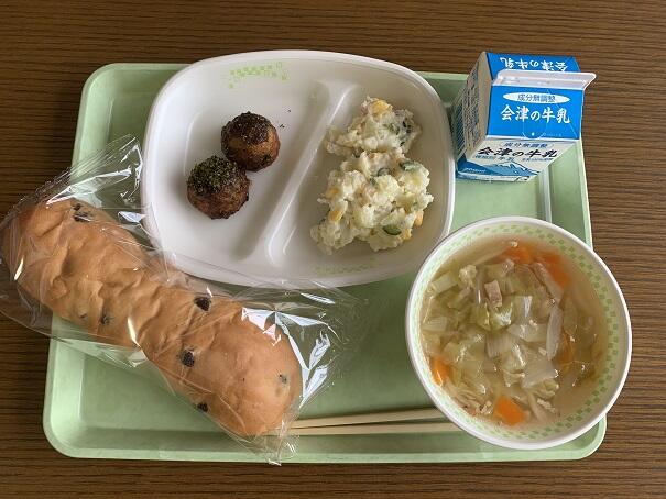 5月13日(金) 今日の給食は、レーズンパン、たこ焼き、ポテトサラダ、キャベツのスープ、牛乳でした。給食のレーズンパンを懐かしく思う保護者の皆さんも多いのでは、苦手だった方もいるのでは?(私です…)たこ焼きは大阪名物ですね。給食の献立は、食生活を豊かにするために、地産地消をはじめ、全国各地や世界各国の名物料理などを提唱していただいています。