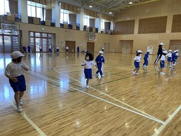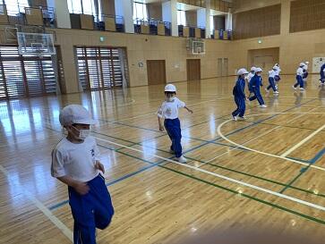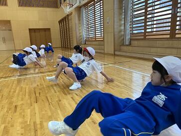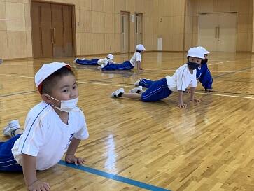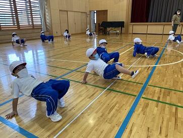 子どもたちは、アザラシ、くも歩きなど、楽しい動きに挑戦していました。