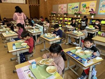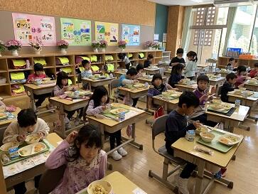 今日の給食は、4月のお誕生日献立でした。4月生まれの皆さん、お誕生日おめでとう!!メニューは、カレーピラフ、にこちゃんポテト、春キャベツのサラダ、ベジタブルスープ、バナナケーキ、牛乳です。1年生のみんなもおいしそうに食べていました。