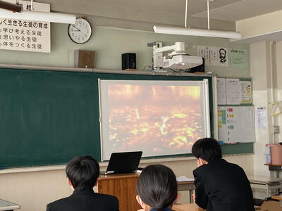 1年の理科は、地球温暖化に関する内容についてのビデオを視聴していました。メタンハイドレートとの関連などにも触れ、地球環境の保全に対する関心を高めていました。熱心な態度でビデオ視聴する姿は、一年間の学びの成果と生徒たちの成長にうれしくなりました。