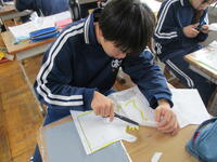 2つ目は、自主学習ノートの取り組みのよい内容を紹介する「自学コンクール」です。学習委員が担任の先生と話し合って、紹介したいノートを選び、職員室前に掲示するとともに、昼の放送で紹介します。今日は4人とも社会の内容で、問題を繰り返して答えたり、ノートの要点を工夫してまとめたり、重要資料や語句をまとめたりしたノートが紹介されました。