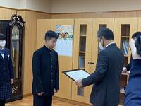 本日、町男女参画川柳コンクールの表彰式が行われました。本校生徒の作品が最優秀賞に選ばれて出席し、町長から表彰状と記念品を授与していただきました。
