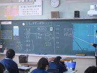 1年生の数学は、比例や反比例の式についての学習でした。数量の関係を式で表現し、比例を表すのか反比例を表すのか考えていました。教科書の問題を言葉の式で考える過程をとおし式表現に挑戦していました。