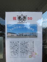 明日は、いよいよ明後日にせまった「統合50周年記念式」の準備となります。記念誌や記念品も完成し、いよいよの感が高まってきました。校内掲示用のポスターも完成しました。