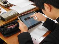 2年2組は社会で,地形図の読み取りをしていました。本郷地区の地形図が電子黒板に表示され,教室内から見える景色と対応させながら読図をしていました。3Dの立体画像も表示され,理解を深めるのに役立っていたようです。