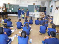 1年1組は理科で,プラスチックについて学習していました。身近な素材について考えることは大切な学習です。ここでは移動式のモニタが使われ,資料が提示されていました。