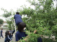 6校時の1年生の総合的な学習の時間に、校地内のりんごの木の摘果作業を行いました。5月に予定されいていたりんごの摘果作業は、4月中旬の霜の影響で作物に被害が出たことにより中止になったため、1年生が初めて作業を体験しました。