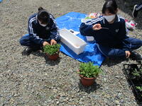 3年生の技術科の授業では、植物の栽培を行っています。「自分で種類を選ぶ」「プランターで栽培できる」という条件で、4月から種まき、間引き、鉢への定植などの作業を学習してきました。また、登校後や昼休み時間には、率先して水を挙げている姿が多く見られます。