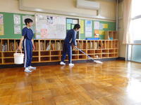 2校時目は2年1組。「連立方程式を利用しよう」という学習で,文章題に取り組んでいました。小黒板を使って,1年生での一次方程式による解法を確認した後,今度は2つの文字を使って連立方程式で解くことになりました。ここで大切なのは,何を文字で表し,どのように式を立てるかということのようです。式ができれば,ほとんどの生徒は計算を進めることができたようでした。花の例題で答えの確認まで扱った後,次はケーキの問題が配付され,例題での学習を生かして自力で解くことになりました。時に友達同士で確認しあいながら学習を進めることができました。二人目の教師が配置されており,個別支援にあたっていました。