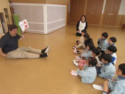 職員と掛け合いで『こんにちは、ばいばい』などの絵本の読み聞かせ。
