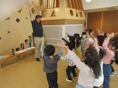 13日(木)に絵本作家のサトシンさんが新鶴こども園に来園、サトシンライブを行いました。